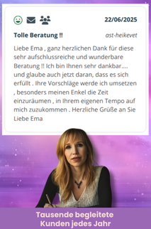 Jedes Horoskop wird mit meinem Herzen ebenso wie mit meinem Verstand analysiert, unter Verwendung des RET-Systems und der prognostischen Astrologie. Mein Ziel? Dass Sie dieses Dokument schließen und sich sagen: "Endlich verstehe ich mich!"