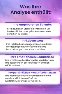 Ein personalisiertes und detailliertes Dokument, verfasst in einer klaren Sprache. Es ist ein wertvolles Werkzeug, begleitet von meinen Ratschlägen zur Aktivierung Ihres Potenzials, das Sie Ihr Leben lang aufbewahren können.